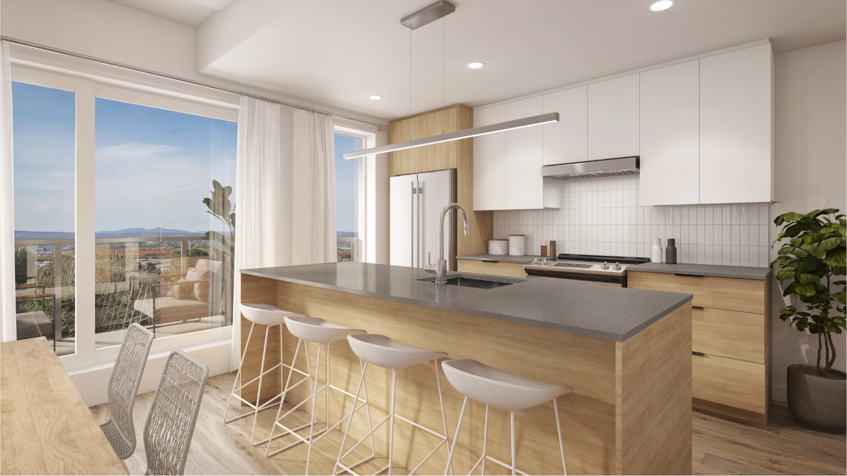 Découvrez nos appartements spacieux, dotés de plafonds de 9 pieds, d’une fenestration abondante et de grands balcons pouvant vous offrir une vue imprenable sur les Laurentides. Les matériaux de haute qualité sont bien conçus pour offrir une touche raffinée à votre quotidien.